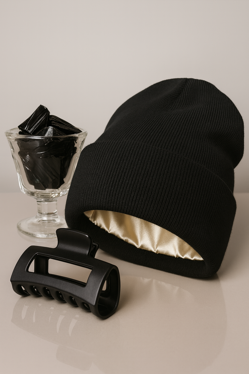 Unlike regular cotton beanies, the smooth satin interior locks in moisture while keeping your head warm and cozy all day.